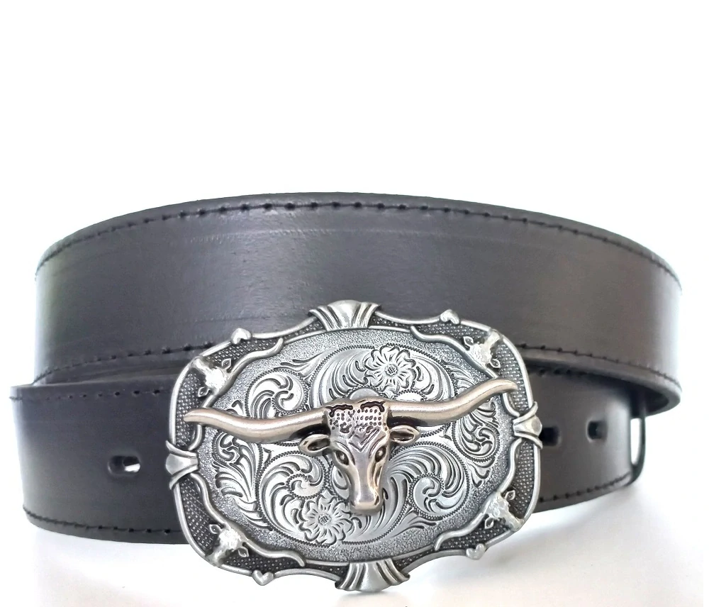 Westernový opasok z čiernej hovädzej kože s prackou s motívom lebky bizóna.