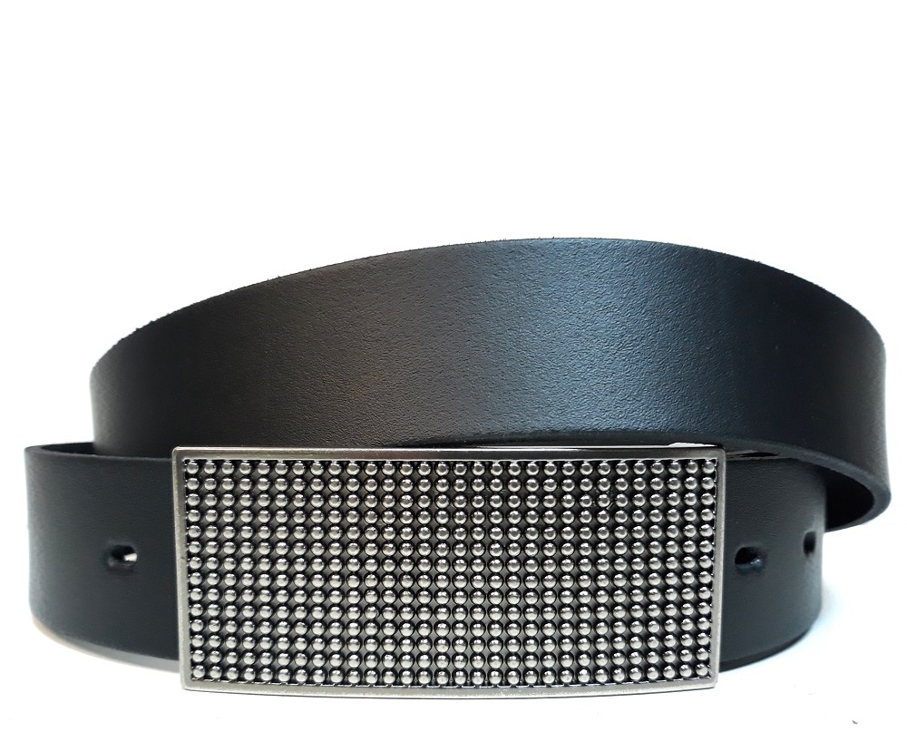- opasok čierny kožený s väčšou kovovou sponou s 3D dizajnom