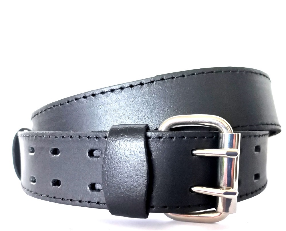 Kožený opasok z čiernej hovädzej kože s veľmi pevnou dvojstrmeňovou nerezovou sponou.