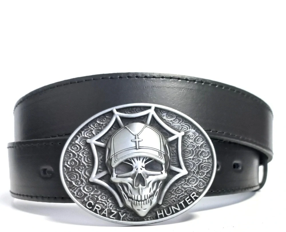 Kožený opasok čierny s veľkou prackou s lebkou.