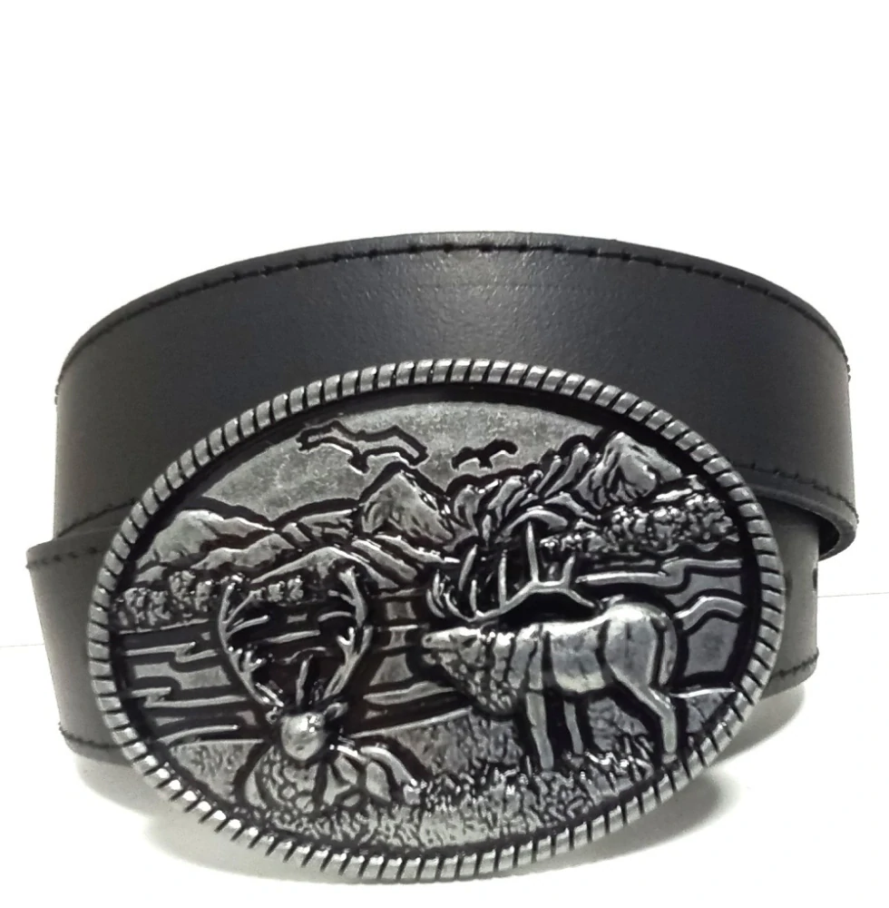 Čierny opasok z hovädzej kože s poľovníckou prackou jelene.