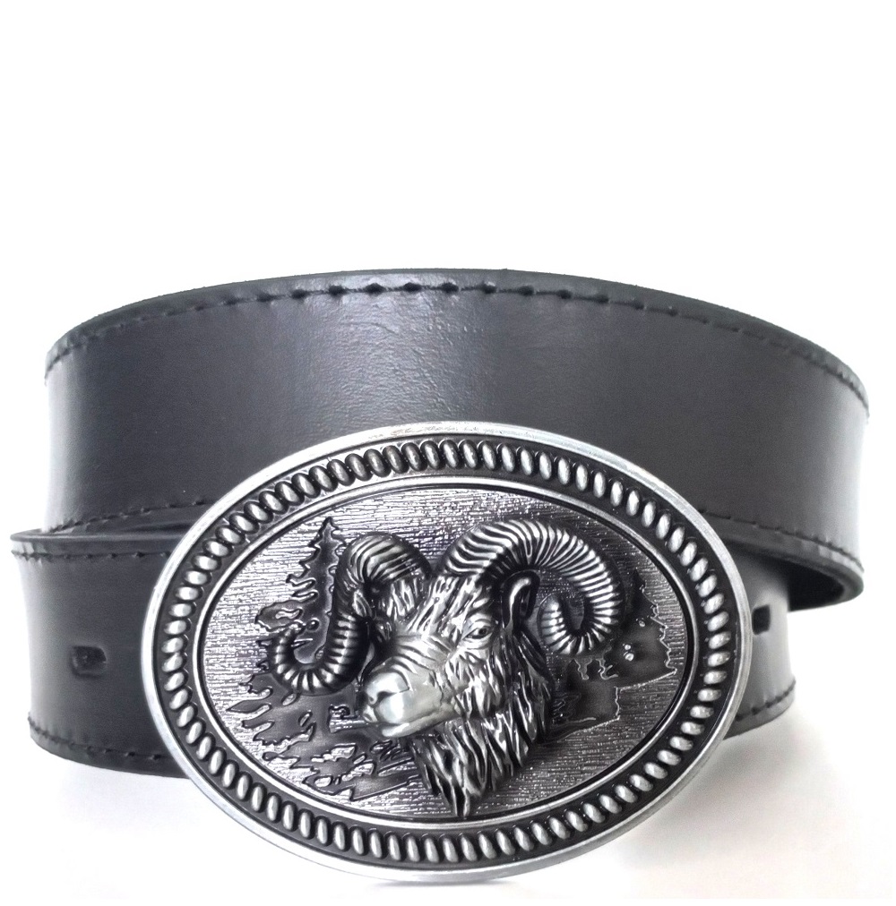 Opasky z čiernej hovädzej kože so starostriebornou prackou s poľovníckym motívom s muflónom.