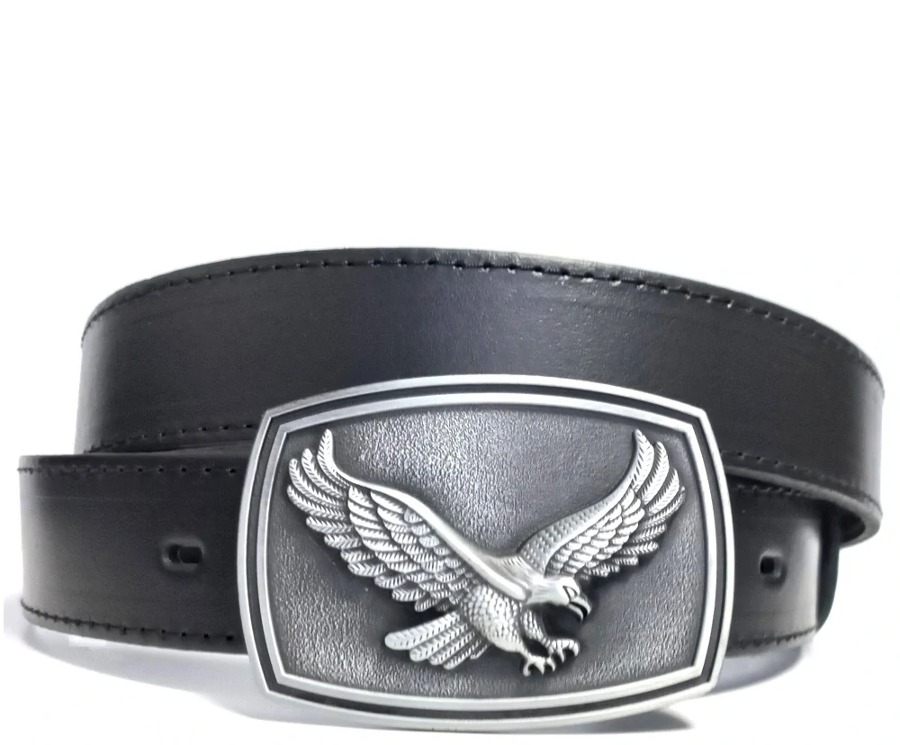 Kožené opasky z čiernej hovädzej kože s veľkou 3D prackou v tvare orla.