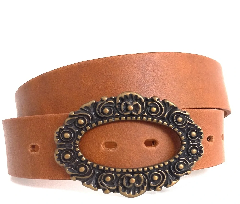Dámsky kožený opasok s oválnou staromosadznou prackou.